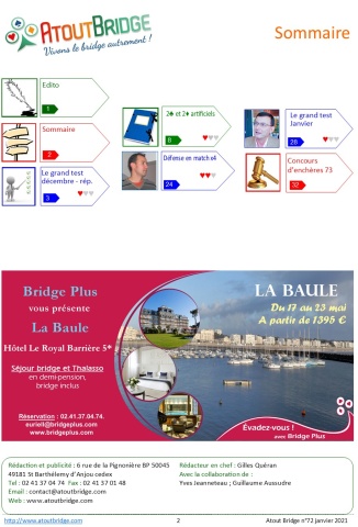 AtoutBridge.com, magazine du bridge en ligne, vous propose tous les mois les dernières actualités, des articles pédagogiques, des jeux, etc... Revenez nous voir souvent ! AtoutBridge.com, 135 rue de la Chalouère - 49100 Angers - 02 41 37 04 74 - Siret : 41141603500037 - Conditions générales de vente