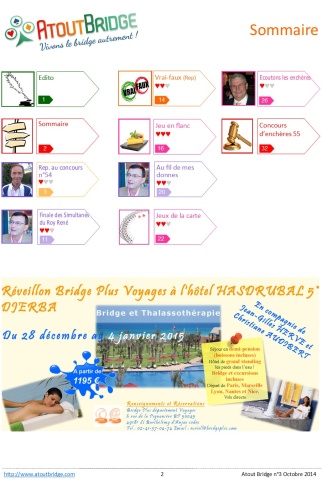 AtoutBridge.com, magazine du bridge en ligne, vous propose tous les mois les dernières actualités, des articles pédagogiques, des jeux, etc... Revenez nous voir souvent ! AtoutBridge.com, 135 rue de la Chalouère - 49100 Angers - 02 41 37 04 74 - Siret : 41141603500037 - Conditions générales de vente
