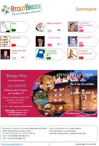 AtoutBridge.com, magazine du bridge en ligne, vous propose tous les mois les dernières actualités, des articles pédagogiques, des jeux, etc... Revenez nous voir souvent ! AtoutBridge.com, 135 rue de la Chalouère - 49100 Angers - 02 41 37 04 74 - Siret : 41141603500037 - Conditions générales de vente