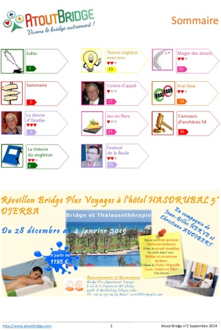 AtoutBridge.com, magazine du bridge en ligne, vous propose tous les mois les dernières actualités, des articles pédagogiques, des jeux, etc... Revenez nous voir souvent ! AtoutBridge.com, 135 rue de la Chalouère - 49100 Angers - 02 41 37 04 74 - Siret : 41141603500037 - Conditions générales de vente