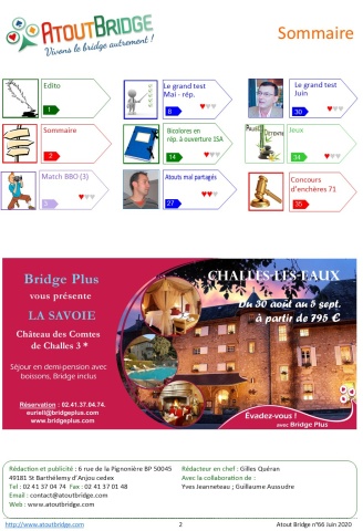 AtoutBridge.com, magazine du bridge en ligne, vous propose tous les mois les dernières actualités, des articles pédagogiques, des jeux, etc... Revenez nous voir souvent ! AtoutBridge.com, 135 rue de la Chalouère - 49100 Angers - 02 41 37 04 74 - Siret : 41141603500037 - Conditions générales de vente